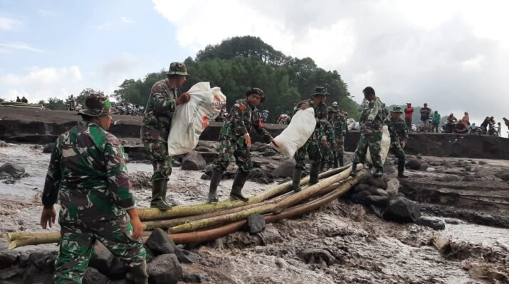 Lumajang — Di tengah derasnya banjir lahar dingin Gunung Semeru, prajurit TNI dari Kodim 0821/Lumajang kembali menunjukkan dedikasi tanpa batas dalam melindungi keselamatan masyarakat.