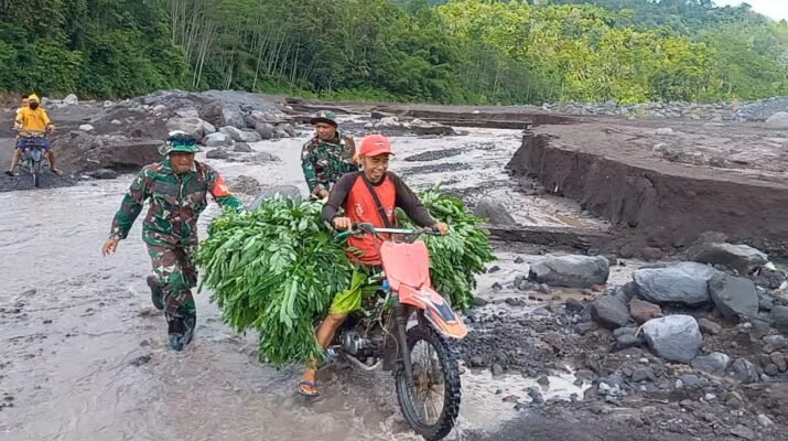 Lumajang – Di tengah cuaca yang tidak menentu dan aktivitas lahar dingin yang masih terjadi pasca-erupsi Gunung Semeru, Personel TNI kembali menunjukkan komitmen kemanusiaan mereka.