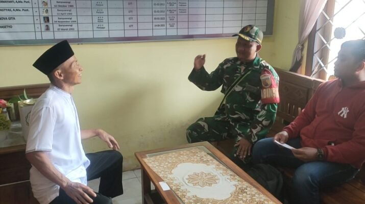 Sempu – Babinsa Desa Jambewangi, Sertu Madroji dari Koramil 0825/19 Sempu, melaksanakan kegiatan Komunikasi Sosial (Komsos) dengan para guru dan siswa di salah satu